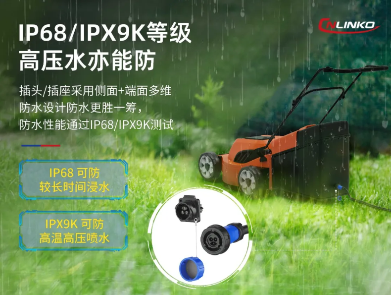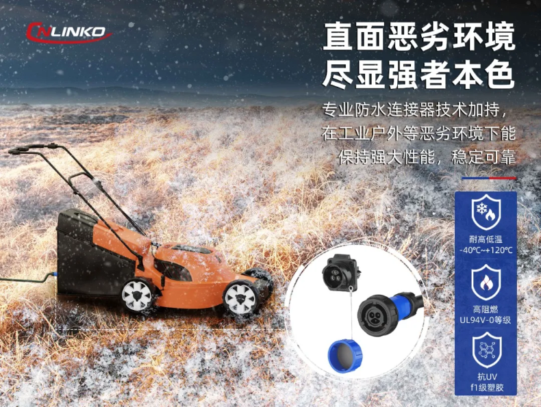 割草機(jī)充電連接器面臨多重環(huán)境威脅。主要為①戶(hù)外移動(dòng)充電:雨水/露水侵蝕;②設(shè)備清洗維護(hù):高壓水霧沖擊;③作業(yè)殘留物:粉塵侵入。