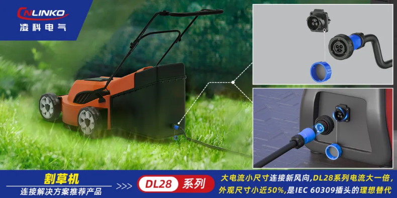 目前凌科DL28系列連接器正廣泛應(yīng)用于各類(lèi)商用及家用割草設(shè)備。它相較于傳統(tǒng)IEC60309插頭實(shí)現(xiàn)體積縮減近半的顛覆性突破,深受市場(chǎng)認(rèn)可,不僅精準(zhǔn)解決了割草設(shè)備輕量化、緊湊化布局的關(guān)鍵需求,更以快充、二級(jí)鎖、IP68/IPX9K旗艦防護(hù)、寬幅耐溫及抗腐蝕阻燃等全能特性,成為時(shí)下割草設(shè)備領(lǐng)域?qū)I(yè)電源連接的理想方案。