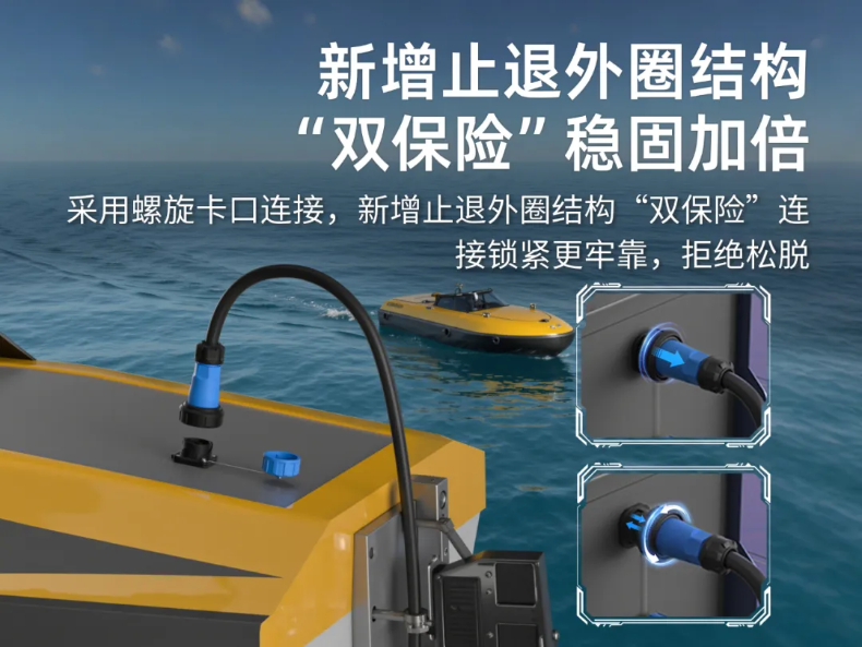 DL28工業(yè)連接器配備 “螺旋卡口+止退外圈”雙重鎖定結(jié)構(gòu),相比IEC60309插頭等連接器單一鎖定的傳統(tǒng)方案,其連接更為牢固可靠,抗振、抗沖擊、抗拉拔性能顯著提升,確保無人船航行中電氣連接穩(wěn)固無松動,保障設備連續(xù)安全運行。
