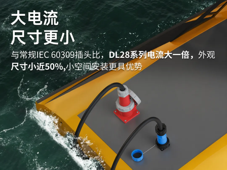 相較于IEC60309插頭,DL28工業(yè)連接器實現(xiàn)了顛覆性的尺寸縮減,顯著優(yōu)化空間占用并減輕負載,契合了無人船輕量化、緊湊化的核心需求。其差異化競爭優(yōu)勢突出體現(xiàn)在以下方面: